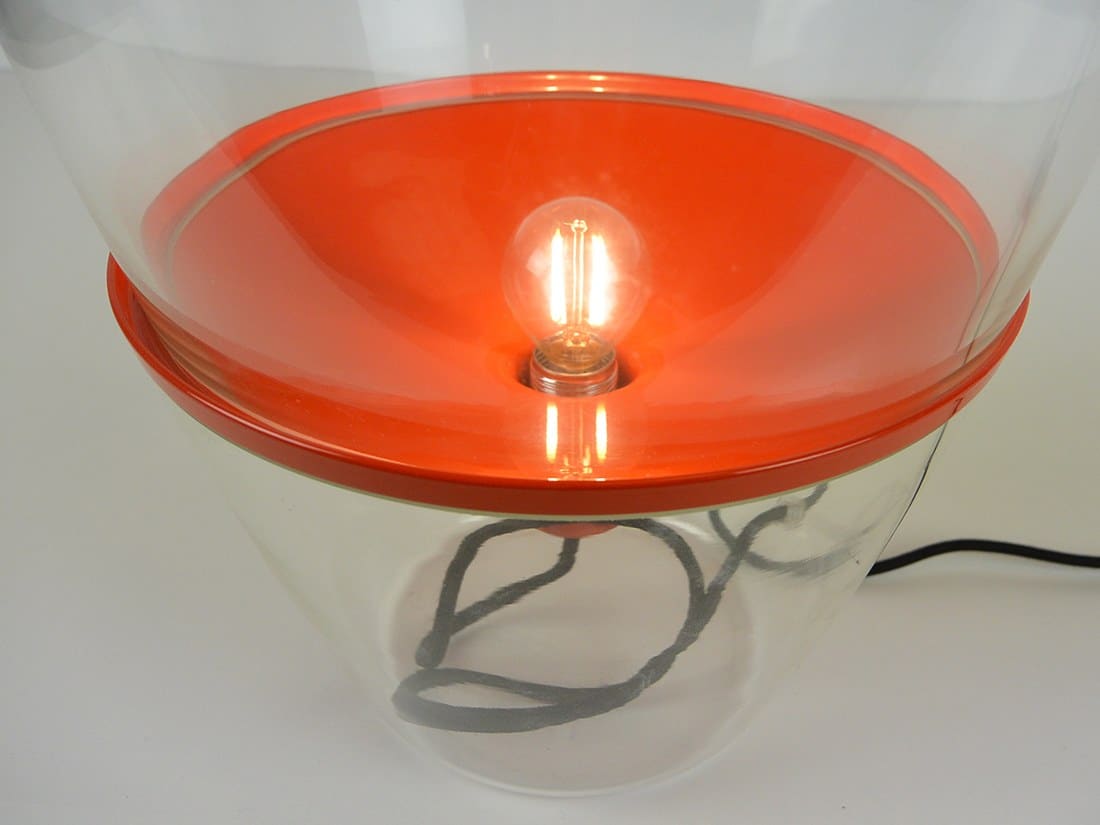 Brokis Balloon tafellamp small ontworpen door Lucie Koldova en Dan Yeffet. Hoogte 40cm, Diameter 28,5cm. Glas helder, reflector rood/oranje. Lamp is in zeer goede staat.